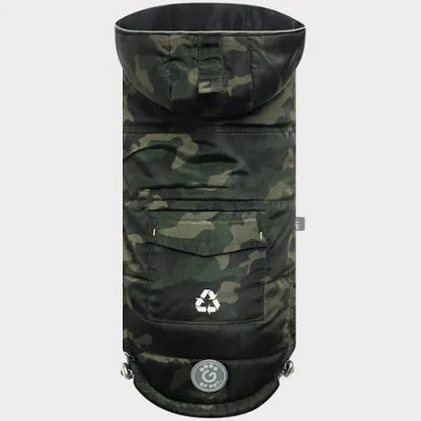 The GF Pet® Recycled Parka is made from 100% recycled fabrics. The fabric used to make this sustainable parka is produced from recycled water bottles and is responsible, versatile, heritage-inspired and weather resistant. Enjoy the ever-stylish GF Pet® signature contrast binding and accents. With its' tackable hood, practical real pocket and reflective piping, it will keep your dog protected and cozy. Super adjustable, with patented Elasto-Fit® technology! For dogs and owners who are proud to support our planet.
